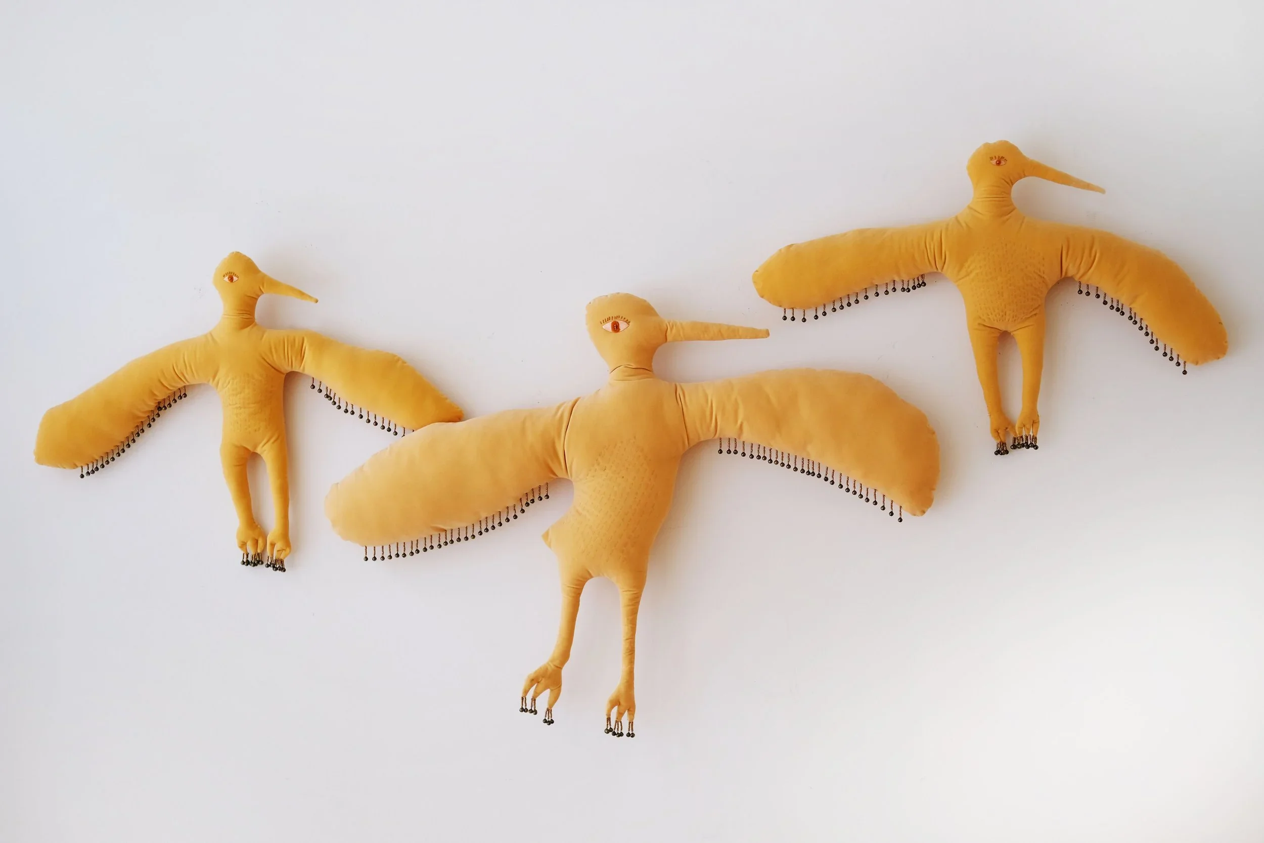 Pénélope Lenaerts currently lives and works in Oakland, California. Raised in Oklahoma and now based on the West Coast, she is a mixed-media artist whose practice is shaped by natural environments, storytelling, spirituality, and symbolism. Her work blends drawing and painting with soft sculpture, creating forms that evoke softness, familiarity, and the search for guidance in an often uncertain world. Materials such as natural dyes, raw wool, horse and goat hair, driftwood, and found objects frequently appear in her work for their symbolic resonance.